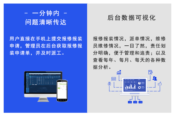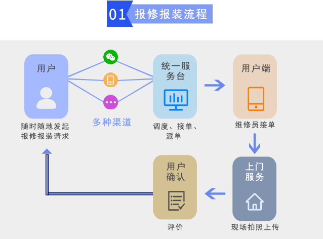 在線報修報裝系統(tǒng),可幫助企業(yè)實現(xiàn)輕松、規(guī)范、細(xì)致的報修、派單、接單、維修報裝、評價等一體化管理工作,提高管理效率、實時掌握、準(zhǔn)確、全面的報修報裝進(jìn)度,高效控制報修報裝全部過程。